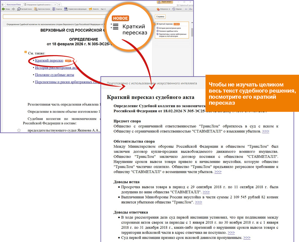 В системе КонсультантПлюс появилась новая функция на основе искусственного интеллекта — Краткий пересказ судебного решения. Теперь можно мгновенно получить выжимку судебного акта, не читая многостраничный текст решения. Мы ценим ваше время!